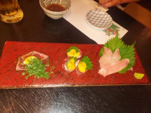 和牛ウニ巻きの入った肉刺し3点盛り(たん刺し、和牛ウニ巻き、牛ハツのタタキ)は、ここ『たん博』さん発祥らしく、これもまた激ウマッ!