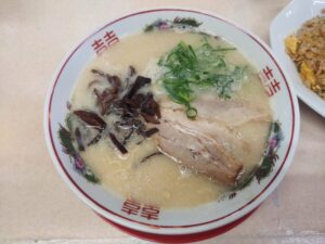 ラーメンは長浜ラーメン風のあっさりとんこつスープに細いストレート麺!