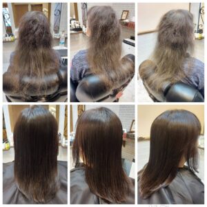 更に今、話題の超音波ケアアイロン『ケアプロ』&『モイストバブル』を使用することによりパワーアップした『美髪チャージ』なら、こちらのお客様の毛先部分のビリビリになった髪も2回、3回とやればやるほどに修復していけると思います!