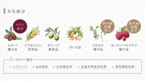 ホホバ種子油、トウモロコシ胚芽油、オリーブ果実油、クロヨナ種子油、ヨーロッパキイチゴ種子油、大豆油、トコフェロール(ビタミンEの一種)