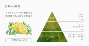柑橘系(レモン、ライム、オレンジ)とシダーウッドを基調に、さまざまなシーンに調和する香りへとまとめ上げました。